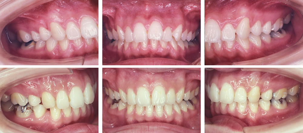 10代の女性です。歯が並びきらないことを気にされて来院されました。分析の結果、突出した前歯と叢生を改善するために上下左右小臼歯を抜歯して矯正治療を行いました。初診時、根管治療中だった左下大臼歯は一般歯科にて治療を継続して冠を装着しました。治療の結果、前歯の突出と叢生は改善し、良好な噛み合わせになりました。